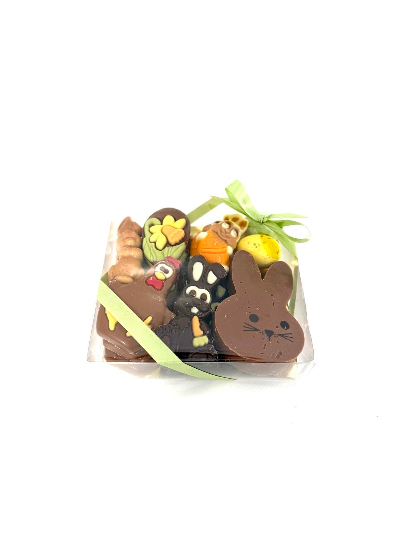 Mica doosje met 6 melk-, 3 witte- & 3 pure caraques, 1praliné haasje, 1 spekhaas & 2 pralines